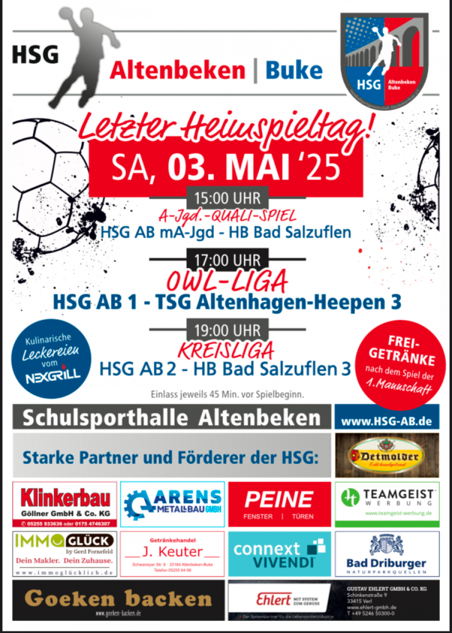 Rund um das Spiel hat der Verein ein tolles Rahmenprogramm gesteckt. Zunächst trifft um 15 Uhr die A-Jugend in der Qualifikation auf HB Bad Salzuflen, um 17 Uhr spielt die ERSTE gegen die TSG Altenhagen-Heepen II und im Anschluss bestreitet die Zwote um 19 Uhr ihr letztes Heimspiel gegen HB Bad Salzuflen 3. Zudem ist auch wieder für das leibliche Wohl gesorgt. Nach dem Spiel der ERSTEN gibt es sogar Freigetränke. Daher freut sich nicht nur die ERSTE, sondern auch der ganze VEREIN, über zahlreiche Zuschauer:innen, die unsere drei Mannschaften unterstützen und für einen gelungenen Saisonabschluss sorgen.