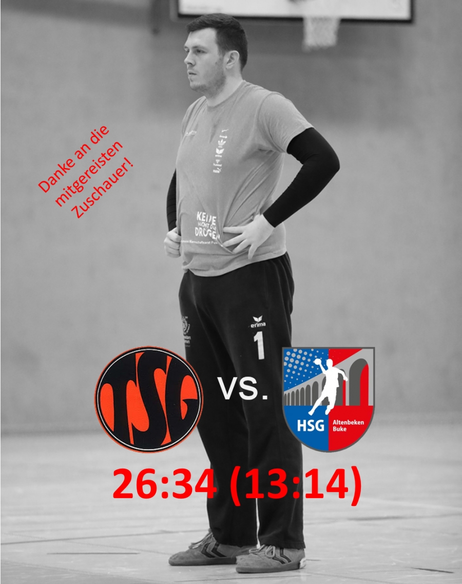TSG Harsewinkel – HSG AB: 0:1; 2:2; 3:5 (8. Min); 4:5; 5:8 (15. Min); 8:8 (20. Min); 9:10; 11:11; 11:12; 13:12; 13:14 (HZ) 13:15; 14:15; 14:17; 16:18 (36. Min); 16:21; 18:21; 20:23; 21:25; 21:28; (54. Min); 22:30; 25:33; 26:34 (Ende)