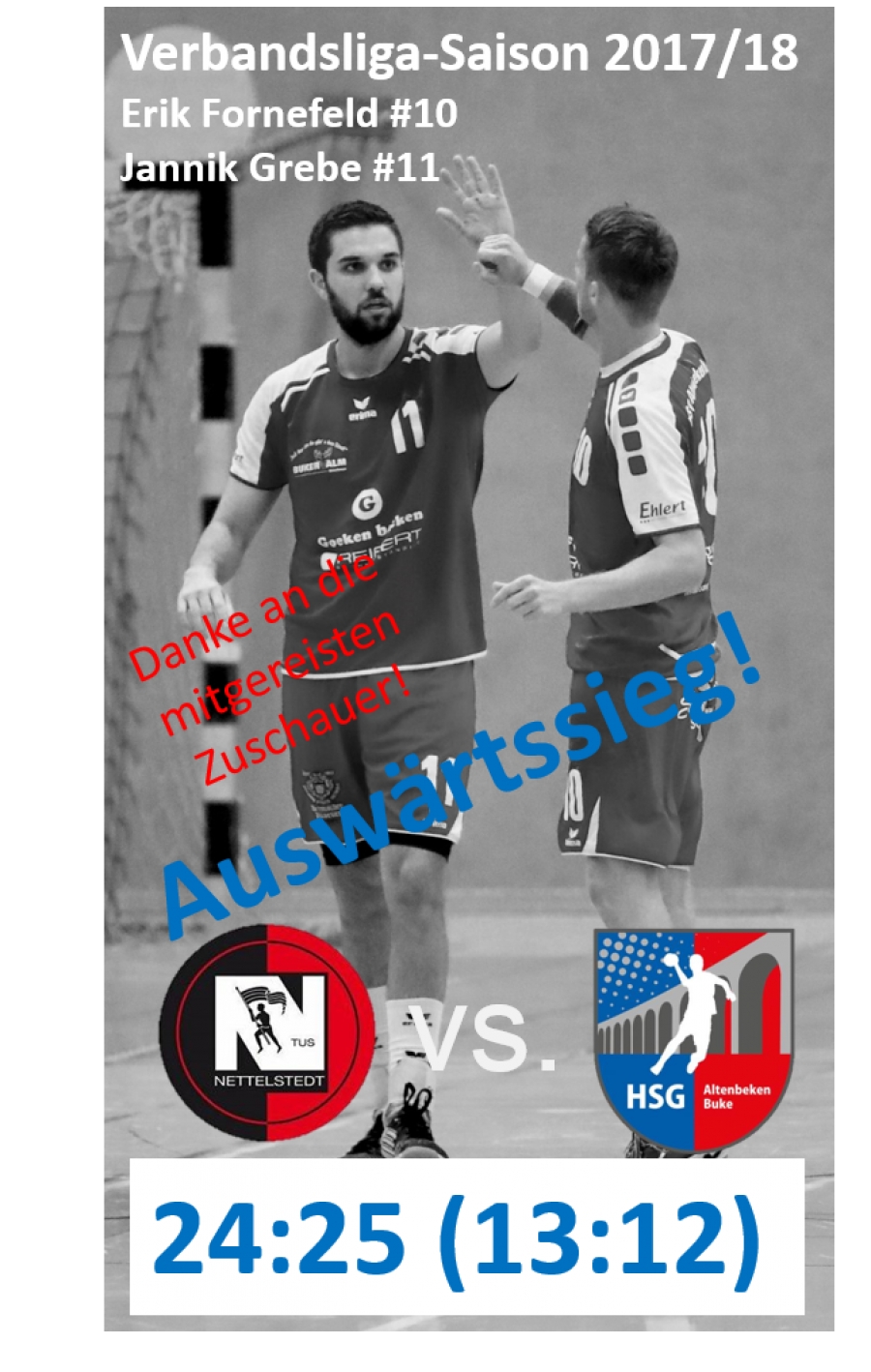 Für die schwierigen personellen Voraussetzungen machte die Mannschaft ein sehr gutes Spiel, welches natürlich in der 2. Halbzeit fortgesetzt werden sollte. Dieses Vorhaben ging jedoch zunächst gründlich schief, klappte doch in der ersten Viertelstunde der 2. Halbzeit insbesondere im Angriff kaum etwas. Fehler im HSG-Angriff konnten die Gastgeber zu leichten Treffern aus dem Tempospiel nutzen und sich nach einem 8:3-Lauf auf 21:15 in der 45. Minute absetzen. Sollte man so weiterspielen und am Ende mit einer 10-Tore-Klatsche die weite Heimreise antreten? Nö, lieber nochmal alle Kräfte mobilisieren und sich als Team gegen die drohende Niederlage stemmen: Mit einem Doppelpack von Yannic Hennemann und einem verwandelten Siebenmeter von Daniel Wiemann verkürzte die Erste zunächst auf 21:18. Wichtig, dass Daniel alle 3 Siebenmeter für die HSG souverän verwandeln konnte und die beiden HSG-Torwarte Christian Harst und Thomas Stennes jeweils einen Siebenmeter der Gastgeber entschärfen konnten. In die letzten 10 Spielminuten ging Nettelstedt mit einer 22:19-Führung. In den letzten Spielminuten schwächte sich die HSG selber noch mit zwei völlig unnötigen Zeitstrafen, ließ sich aber auch vom Unterzahlspiel nicht mehr aufhalten. In der Abwehr wurde um den starken Mittelblock mit Yannic Hennenmann, Jonas Schäfers und Malte Werning Beton angerührt und auch Torwart Christian Harst, der die ganze Zeit gut im Spiel war, konnte sich in der Schlussphase noch weiter steigern und ganz wichtige Bälle parieren. Im Angriff konnte die Erste ein druckvolles, aber auch sicheres und geduldiges Spiel umsetzen. Damit konnte das Team zunächst auf 22:21 (54. Min) verkürzen und nach dem 23:21 erzielten Yannic und Jannik, der das HSG-Spiel grippegeschwächt hervorragend dirigierte, den 23:23-Ausgleich. Mit Malte Werning musste zu diesem Zeitpunkt ein wichtiger Spieler mit brummenden Schädel von der Bank zuschauen. Der Zusammenprall mit dem gegnerischen Torwart im Tempogegenstoß stellte für die HSG ein Beispiel wie aus dem Bilderbuch für eine klare Rote Karte dar, die Schiedsrichter zeigten jedoch lieber einem mitgelaufenen Feldspieler der Nettelstedter eine Zeitstrafe. Yannic Hennemann übernahm weiter viel Verantwortung und erzielte mit seinem 7. Treffer im Spiel den 24:24-Ausgleich. Mit vereinten Kräften ließ die HSG danach keinen Gegentreffer mehr zu und Jannik Grebe spielte einen tödlichen Pass genau in die Schnittstelle der Abwehr, so dass Michael Schasdomsky für den Siegtreffer freie Bahn hatte. Nach einem gemeinsamen Kraftakt, einer tollen Teamleistung und mit hervorragender Moral konnte die Erste nach 60 Minuten den umjubelten und immens wichtigen Auswärtserfolgt feiern!