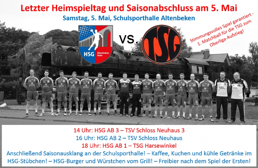 Nun gilt es, sich mit einer vernünftigen Trainingswoche für das letzte Heimspiel der Saison 2017/18 zu rüsten! Und das hat es in sich: Mit der TSG Harsewinkel kommt der designierte Meister und Oberliga-Aufsteiger in die Schulsporthalle, der in der Schulsporthalle den ersten von zwei Matchbällen zum Aufstieg hat. Die TSG will aufsteigen und muss dafür gewinnen - die HSG wird alles daran setzen, sich mit einer guten Leistung von den eigenen Zuschauern zu verabschieden und will dafür gewinnen! Daraus wird sich mit Sicherheit ein stimmungsvolles Spiel entwickeln, dass sich kein Handball-Fan aus der Eggegemeinde entgehen lassen sollte! Zumal im Anschluss der traditionelle Saisonausklang mit Freibier und dem Besten vom Grill an der Schulsporthalle auf dem Programm steht!