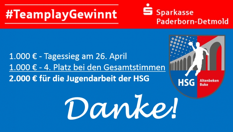 Die HSG Altenbeken/Buke bedankt sich ganz herzlich für die tolle Unterstützung beim Gewinnspiel #TeamplayGewinnt der Sparkasse Paderborn-Detmold! Mit Eurer Unterstützung gelang direkt am 26. April ein Tagessieg und bei den Gesamtstimmen sprang am Ende mit 670 Stimmen ein toller 4. Platz heraus! Sowohl der Tagessieg als auch der 4. Platz bei den Gesamtstimmen bringen der HSG jeweils 1.000 €, die gewinnbringend in der Jugendarbeit der HSG eingesetzt werden!