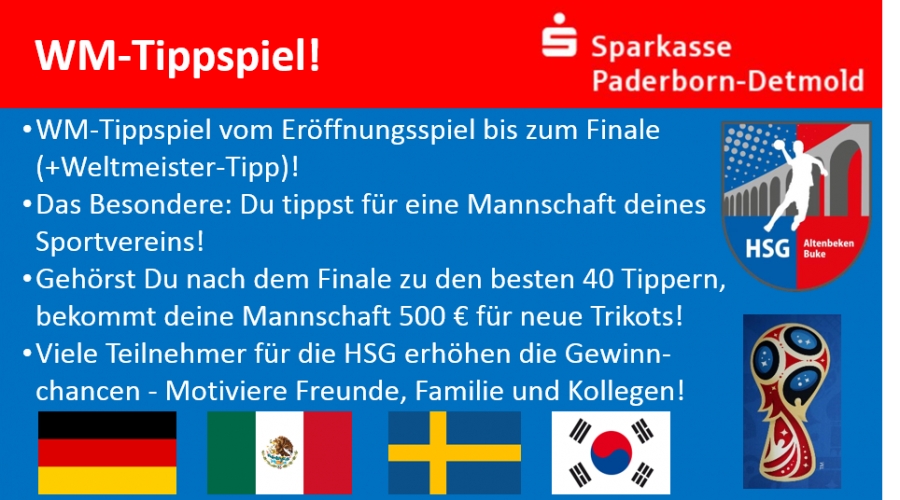 Tippspiele zu sportlichen Großereignissen wie Welt- oder Europameisterschaften erfreuen sich im Freundes-, Familien- und Kollegenkreis schon lange großer Beliebtheit. Passend zur Fussball-WM gibt es jetzt erneut ein Gewinnspiel der Sparkasse Paderborn-Detmold für Vereine aus der Region: Das Besondere beim Tippspiel zur WM ist jedoch, dass nicht der Teilnehmer selbst gewinnt, sondern für eine ausgewählte Mannschaft seines Sportvereins eine Spende über 500 € für neue Trikots erspielen kann! Viele Teilnehmer für HSG-Mannschaften sind dabei keinesfalls Konkurrenzen - Ganz im Gegeteil: Jeder Teilnehmer für die HSG erhöht die Chancen, dass unser Verein erneut zu den Gewinnern zählen kann! Insgesamt erhalten die ersten 40 Plätze jeweils 500 € für neue Trikots. Wir hoffen auf viele Tipp-Meister, die für eine Mannschaft der HSG ihr Glück versuchen! Gerne dürfen auch Freunde, Familienmitglieder oder Kollegen motiviert werden, für die HSG-Mannschaften teilzunehmen! Zum Gewinnspiel geht es unter folgendem Link www.sparkasse-paderborn-detmold.de/tippspiel