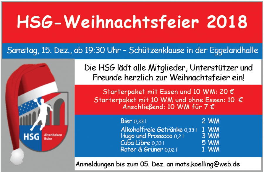 Langsam aber sicher nähert sich das Jahr 2018 schon wieder dem Ende. Daher sind alle Mitglieder, Unterstützer und Freunde der HSG herzlich zur Weihnachtsfeier eingeladen, um gemeinsam an einem geselligen Abend das Handball-Jahr 2018 Revue passieren zu lassen und um sich über Themen fernab des Handballs austauschen zu können. Die diesjährige Weihnachtsfeier findet am Samstag, den 15. Dezember, statt. Nach dem Heimspieltag ist ab 19:30 Uhr der Weg von der Schulsporthalle in die Schützenklause der Eggelandhalle nicht weit. Dort wird für das leibliche Wohl bestens gesorgt sein. Die HSG hofft auf zahlreiche Anmeldungen zur Weihnachtsfeier unter Diese E-Mail-Adresse ist vor Spambots geschützt! Zur Anzeige muss JavaScript eingeschaltet sein! und freut sich auf einen schönen Abend mit euch!